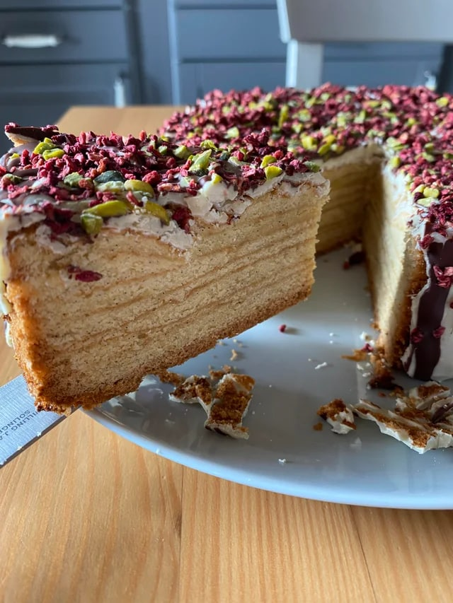 Eiweiß zu steifem Schnee schlagen und unter den Teig ziehen. Eine Springform (16cm Durchmesser) einfetten und mit Mehl ausstäuben. 1 EL Teig hineingeben und dünn verstreichen. Im Backofen auf der oberen Einschubleiste ca 4 Minuten backen. Darauf wieder 1 EL Teig verstreichen und backen. Auf diese Weise die Form bis zum Rand füllen.