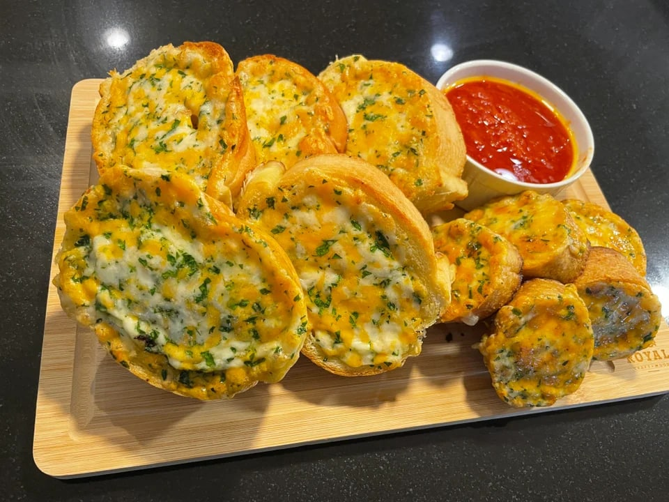 garlic confit’d in ghee mixed with mozz, medium cheddar, and fresh parsley..i toasted one side in a garlic herb olive oil and spread the ghee/cheese mixture on the other end and put it under the broiler until it looked like that