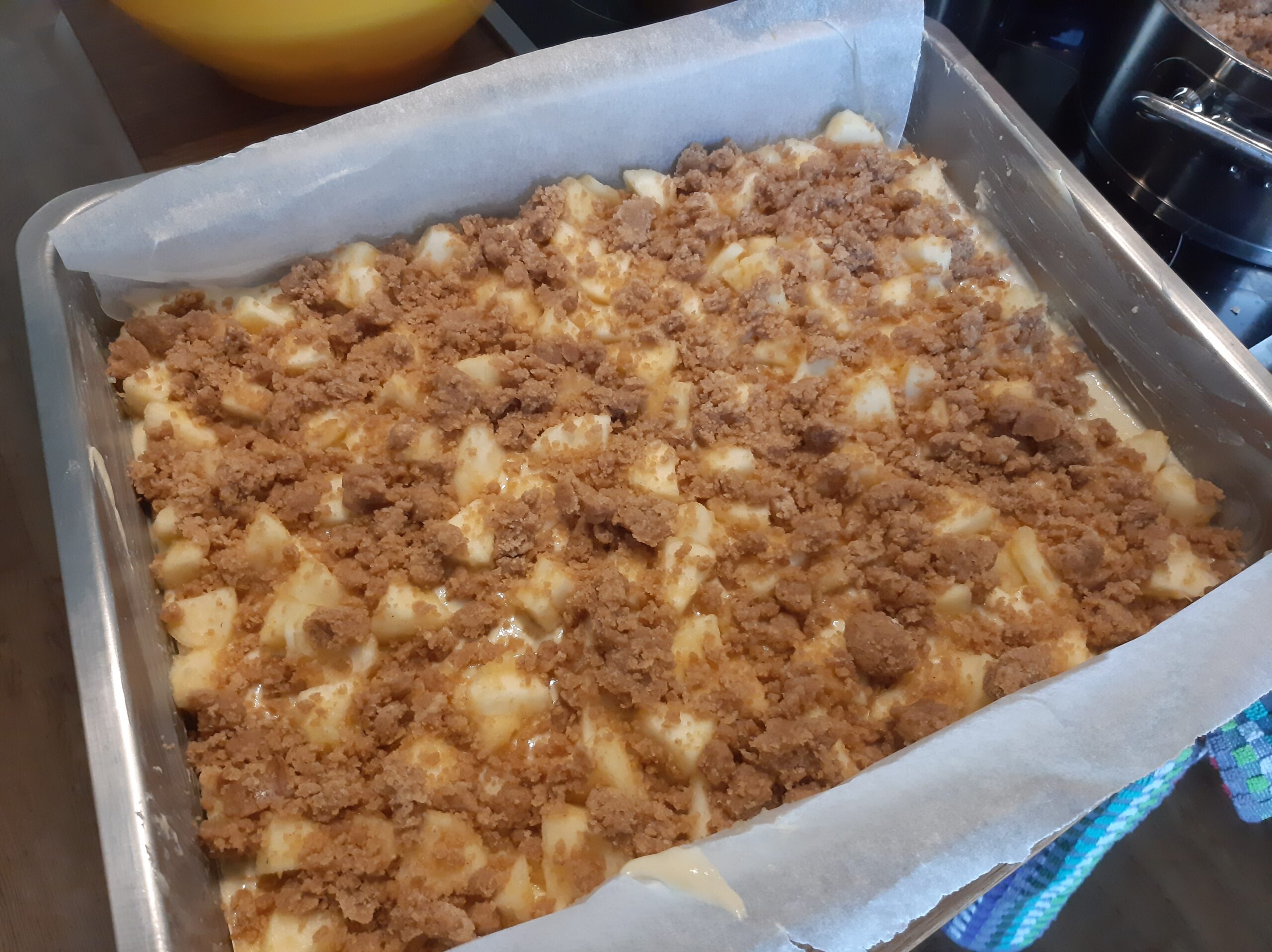 Die Hälfte des Rührteigs in eine Backform geben. Danach folgt die Hälfte der Äpfel und die Hälfte der Streusel. Dies wird mit der zweiten Hälfte aller Zutaten wiederholt, sodass ein zweischichtiger Kuchen entsteht.